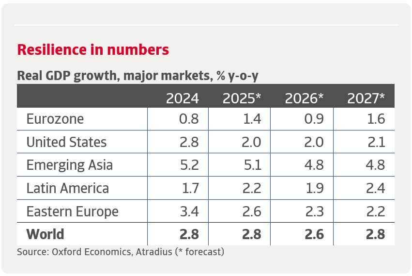 Global GDP growth is forecast to moderate to 2.6% in 2026 and recover slightly to 2.8% in 2027. The US is expected to maintain growth around 2.0% in both years, while Emerging Asia remains the global growth leader, albeit at a somewhat lower rate. The eurozone is projected to see muted growth, at 0.9% in 2026 and a mild rebound to 1.6% in 2027. Latin America and Emerging Europe are forecast to hover around 2% growth.