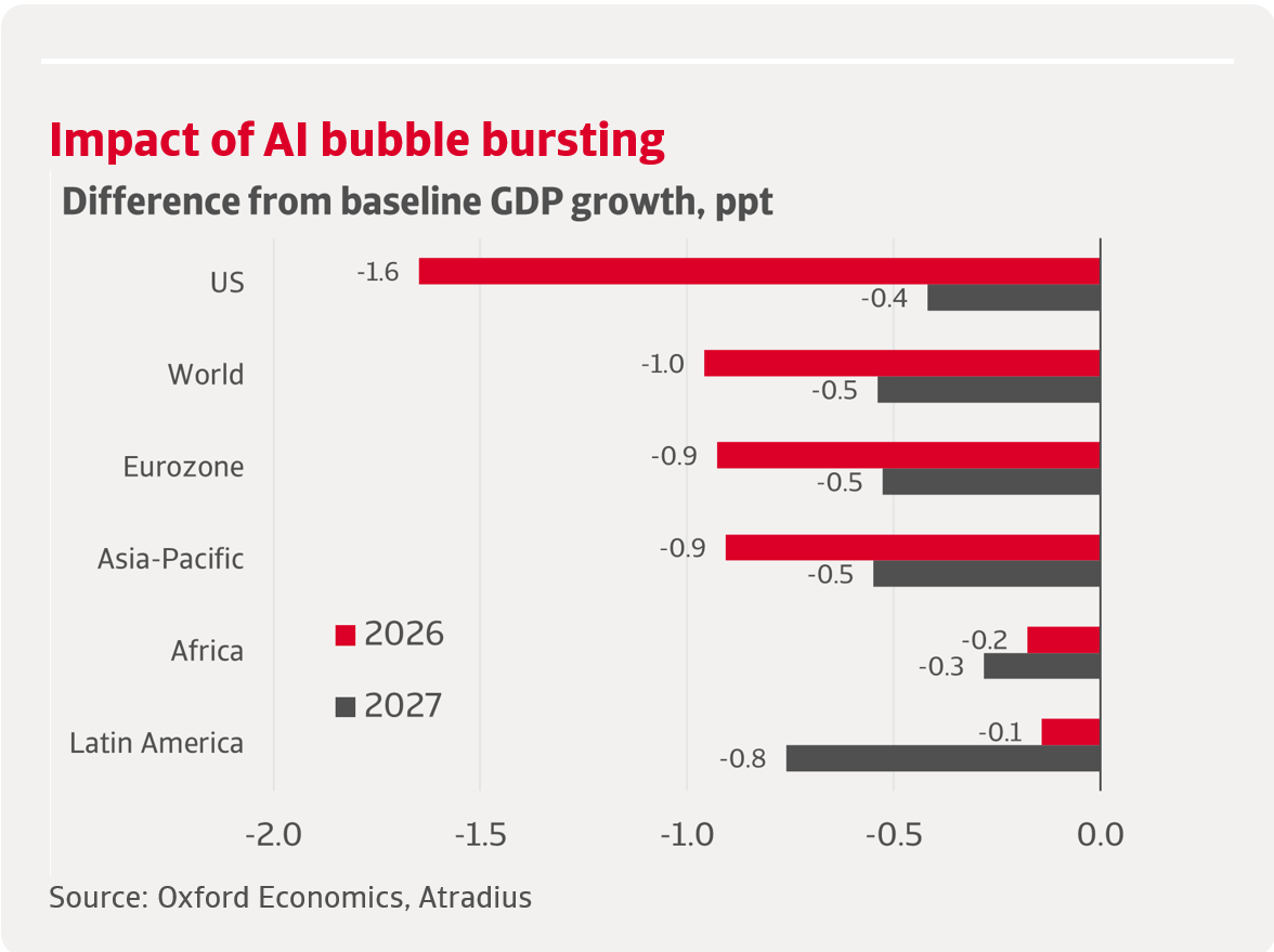 A sharp decline in confidence in the future benefits of AI could trigger an abrupt end to the current investment boom, resulting in a pronounced AI bubble burst. In this downside scenario, US tech stocks would fall by around 25%, leading to a significant loss of household wealth and a sharp slowdown in consumer spending and corporate investment, particularly in the technology sector. Exports would decline, business sentiment would deteriorate worldwide, and tighter financial conditions would amplify the shock. The US dollar would depreciate further, and the Federal Reserve would be forced to respond with additional rate cuts. This would lower global GDP growth in 2026 and 2027 by 1.4 percentage points. The impact would be most severe for the US and major tech exporters in Asia-Pacific, but spillovers would affect all regions.