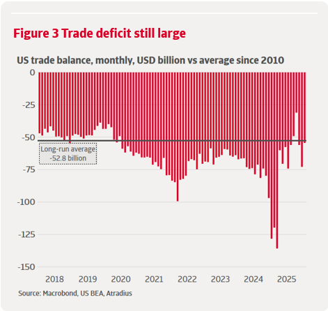 Price effects have further diluted the impact on the nominal trade balance. With higher effective tariff rates came markedly higher customs duties paid by US importers. The New York Fed estimates that 93% of the tariff costs were absorbed by US importers in 2025 rather than passed back to foreign exporters . Higher import prices inflate nominal import values even when volumes soften, limiting potential improvement in the nominal trade deficit.