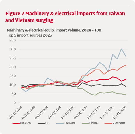 This reconfiguration is most visible in the machinery and electrical equipment sector, which accounts for around one‑third of total US imports. The sector overlaps closely with the capital goods dynamics discussed above, covering industrial machinery, IT hardware for production and electrical equipment for factories and infrastructure. At the same time, it also includes non‑capital goods such as consumer electronics, making it a useful bridge between investment demand and consumer imports.