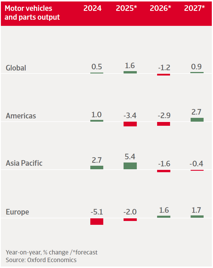 We expect global motor vehicles and parts production to grow by 1.6% in 2025, followed by a 1.2% contraction in 2026. This decrease is partly due to the 15% import tariffs the US has imposed on its major automotive trading partners.