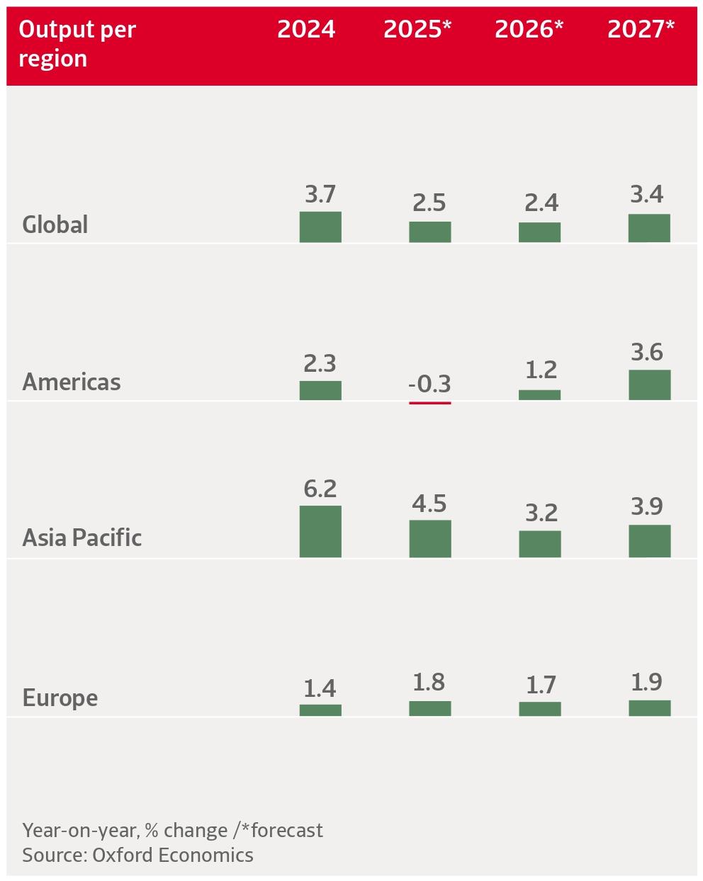At the beginning of this year, we anticipated global transportation and logistics output to increase by 4.3% in 2025 and by 3.7% in 2026. However, we have now revised this forecast downwards to 2.5% and 2.4% respectively, as we expect the pace of trade growth to ease significantly in the last months of 2025 and through 2026. This contrasts with the earlier months of the year where front-loading ahead of trade war restrictions directly boosted global trade growth, while AI-related investment increased the trade in goods related to data centre infrastructure and other AI equipment.